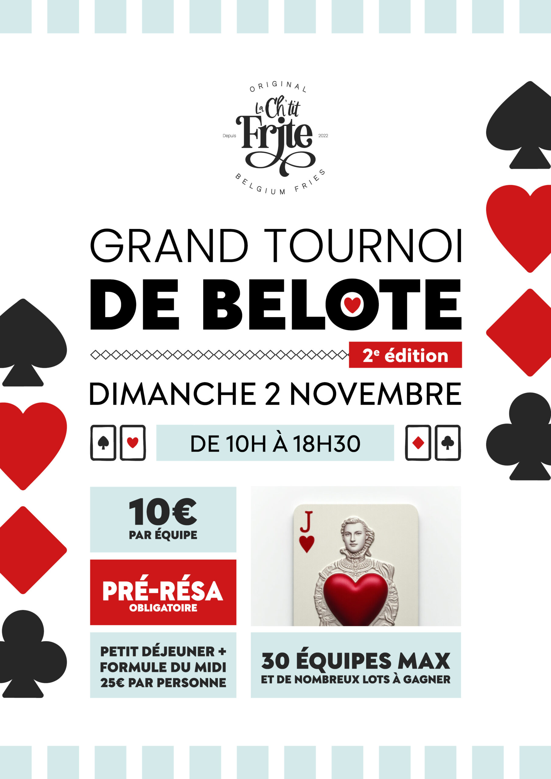 Amateurs de cartes, réservez votre dimanche ! La Ch’tit Frite organise un tournoi de belote le dimanche 2 novembre de 10h à 18h à Saint-Vincent-de-Tyrosse. Une journée placée sous le signe de la convivialité, du jeu et de la bonne humeur vous attend.