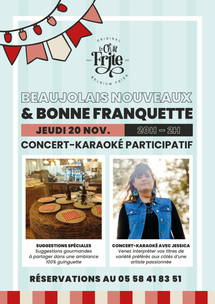 Venez célébrer l’arrivée des Beaujolais Nouveaux dans une ambiance 100% guinguette à La Ch'tit Frite ! Au programme : Suggestions gourmandes à partager & concert-karaoké participatif avec Jessica Ochem. Réservations : 05 58 41 83 51